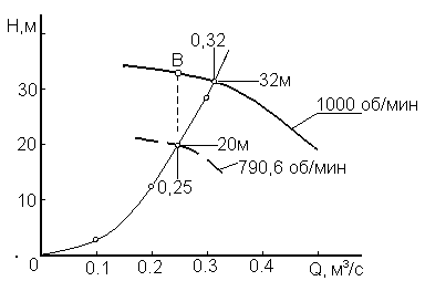 При изменении числа оборотов новые значения Н и Q подчиняются уравнениям (14). Возьмем на характеристике насоса (рис.26) точку с координатами Н1 = 32 м и Q1 = 0,32 м3/с; при изменении числа оборотов новые значения Н2, Q2 в соответствии с уравнением (14) будут располагаться на параболе с вершиной в начале координат и проходящей через точку Н1, Q1. Эта парабола носит название кривой пропорциональности. Пример 4. Для насоса, характеристика которого приведена на рис.26, определить число оборотов, при котором характеристика пройдет через точку Q2 = 0,25 м3/с, Н2 = 20 м. Решение.Проведем через заданную точку кривую пропорциональности по уравнению n2 = Характеристику Q - Н насоса для определенного значения числа оборотов n1 можно выразить аналитически в виде уравнения