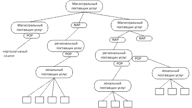 Телефонные линии разделяются на передачу голоса и связи для передачи данных по сети. Трафик данных из системы, как правило, передается локальному поставщику услуг, с которым заключено соглашение. Из-за слияния большого количества телефонных компаний уже сложно определить кто является поставщиком услуг, а кто- оператором связи. В целом структуру можно представить так: