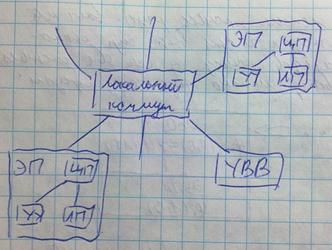 ЭП – элементарный процессор DEC 21064 Alpha. Относится к семейству RISC-процессоров (С сокращенным набором команд). ЛП – локальная память DRAM (Dynamic Random Access Memory, динамическая память с произвольной выборкой). ЛК – локальный коммутатор, включающий в себя маршрутизатор, сетевой интерфейс, контроллер для передачи данных. Маршрутизатор – основной элемент управления сетью. Позволяет работать одновременно с тремя двунаправленными типами связи. Создается т.н. трехмерная структура (выполняется параллельно три связи между ЭП). Сетевой интерфейс копирует и распределяет связи между ЭП. Контроллер ввода-вывода – пересылка блоков информации. Работает без прерывания работы ЭП. Примечание: локальная память физически распределена, но логически общая. Коммуникационную сеть можно представить следующим образом: