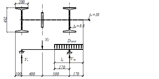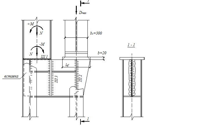 4.3.3 Перевірка стійкості колони в площині дії моменту як єдиного стержня потребує визначення таких величин: - геометричні характеристики переріза в цілому - гнучкість - зведена гнучкість для наскрізного стержня з решіткою(табл. 7[1]), що має параметр - відносний ексцентриситет за розрахунковою комбінацією зусиль, що довантажує зовнішню вітку - коефіцієнт φе за табл. 75[1] в залежності від - відносний ексцентриситет за розрахунковою комбінацією зусиль, що довантажує підкранову вітку - коефіцієнт φе=0,339 та перевірка стійкості: 4.4. Розрахунок і конструювання вузла сполучення верхньої та нижньої частин колони. Розрахункові сполучення зусиль в перерізі 1-1 (над уступом) Максимальне розрахункове вертикальне кранове навантаження на колону Dmax=1171.8 кН. 4.4.1 Перевірка стикового шва Ш1 виконується за нормальними напруженнями за умови повного провару елементів, що з’єднуються, виводу кінців шва за межі стику, застосуванні відповідних зварювальних матеріалів за табл. 55 [1] та фізичного контролю якості розтягненого шва (Rwy=Ry): - по зовнішній полиці:
