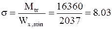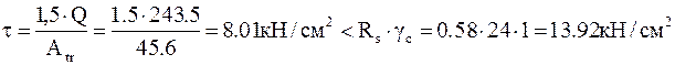 Геометричні характеристики: Atr=38·1.2=45.6 см2; Wtr=1.2·382/6=289 см3. Перевірка напружень в перерізі на опорі: