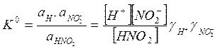 ПРИМЕР 3. Термодинамическая константа кислотности азотистой кислоты равна 6.2·10-4. Рассчитайте реальную константу в растворе с ионной силой 0.01. Решение. В таблицах находим значения коэффициентов активности ионов Н+ и NO2- при ионной силе 0.01: