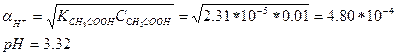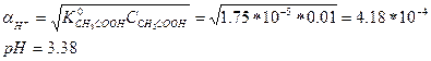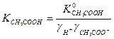 За счет электростатических взаимодействий диссоциация азотистой кислоты усилилась, однако, как показывает следующий пример, электростатические взаимодействия между ионами не могут в заметной степени повлиять на состояние равновесия в системе. ПРИМЕР 4. Как изменится рН 0.010 М раствора уксусной кислоты, если в него добавить хлорид калия до конечной концентрации 0.020 М? Решение. Уксусная кислота слабая, поэтому в отсутствие постороннего электролита ионную силу можно принять равной нулю. Это дает право для вычисления рН воспользоваться термодинамической константой кислотности.