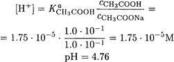 То же выражение можно получить, используя константу второго равновесия. ПРИМЕР 16. Рассчитайте рН буферного раствора, состоящего из 0.10 М уксусной кислоты и 0.10 М ацетата натрия. Решение. Здесь выполняются все условия, позволяющие применить формулу (2-14) (уксусная кислота - слабая кислота, концентрации кислоты и сопряженного основания достаточно высоки). Поэтому