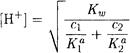 где Ка1 и Ка2 - константы диссоциации сопряженных кислот. На практике чаще, пожалуй, встречаются ситуации, когда одна (одно) из присутствующих в смеси кислот (оснований) подавляет диссоциацию других и поэтому для расчета рН можно учесть диссоциацию только этой кислоты (этого основания), а диссоциацией остальных пренебречь. Но могут встретиться и другие ситуации. ПРИМЕР 20. Рассчитайте рН смеси, в которой общие концентрации бензойной и аминобензойной кислот равны соответственно 0.200 и 0.020 М. Решение. Хотя величины констант диссоциации бензойной (Ка = 1.62·10-6, обозначим К1) и аминобензойной (Ка = 1.10·10-5, обозначим K2) кислот различаются почти на два порядка, из-за довольно большого различия концентраций кислот здесь необходимо учесть диссоциацию обеих кислот. Поэтому по формуле (2-20) находим