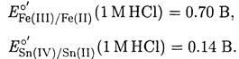 Сравним полученный результат с величиной константы равновесия, рассчитанной по величинам стандартных потенциалов Е°Fe(III)/Fe(II) = 0.771 В и E°Sn(IV)/Sn(II) = 0.154 В.
