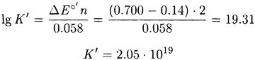 Стандартные потенциалы пригодны для расчетов равновесий в системах, когда можно пренебречь электростатическими взаимодействиями и конкурирующими химическими реакциями с участием окисленной или восстановленной формы. Для уменьшения погрешностей в расчетах, проводимых для реальных условий, используются формальные потенциалы. Формальным потенциалом принято называть потенциал полуреакции при условии, что концентрации окисленной и восстановленной форм равны 1 М, а концентрации посторонних электролитов известны. В ряде учебников и таблицах наряду с величинами стандартных потенциалов для многих окислительно-восстановительных систем приводятся значения формальных потенциалов и указываются условия, в которых они измерены, т. е. состав и концентрация электролита. ПРИМЕР 12. Рассчитайте константу равновесия реакции между ионами железа(III) и олова(II) в 1 М растворе соляной кислоты при 20 °C. В этих условиях