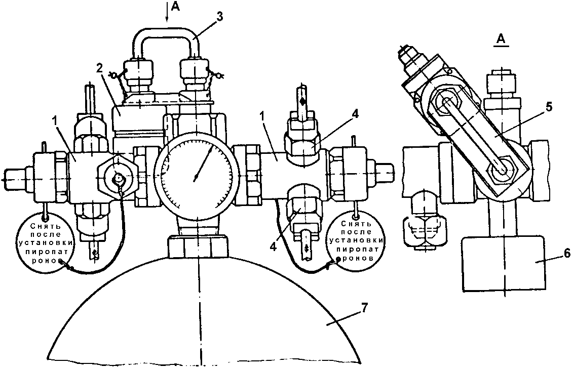 Огнетушитель УБШ-6-2. Огнетушитель представляет собой шаровой унифицированный баллон с двумя клапанными пироголовками (рисунок 9). Рабочее давление в огнетушителе, в зависимости от температуры окружающей среды, может изменяться от 69 кгс/см2 (при t = -60 0С) до 142 кгс/см2 (при t = +80°С). На огнетушителе установлены: манометр МA-250М и сигнализатор давления МСT-40.