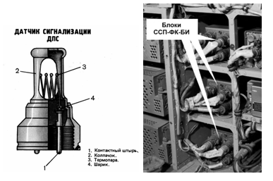 Датчики объединены в группы. В каждой группе расположено по три датчика. В двигательных отсеках расположено по три группы датчиков, в отсеке КО-50-две группы датчиков и в объединенном отсеке главного редуктора и двигателя АИ-9В-шесть групп. Исполнительный блок ССП-ФК-БИ предназначен для усиления сигналов, поступающих от датчиков ДПС, и выдачи команды "ПОЖАР" в виде напряжения +27...29В.