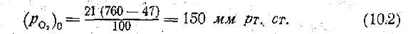 Парциальное давление кислорода в альвеолах легких будет меньше 150 мм рт. ст. из-за меньшего процентного содержания кислорода в альвеолярном воздухе. Зависимость величины парциального давления кислорода на входе в легкие от высоты полета в разгерметизированной кабине приведена на рис. 10.1 (кривая 1). На основании физиологических, исследований установлено, что минимально допустимым, парциальным давлением кислорода является давление 80 мм рт. ст.,когда кровь насыщается кислородом лишь на 80—85% величины нормального насыщения. Такое давление соответствует высоте 4500 км При дальнейшем увеличении высоты в организме человека будут происходить серьезные функциональные расстройства, которые связаны с явлением гипоксии, т. е., с кислородной недостаточностью: В настоящее время принимается, что парциальное давление, кислорода во вдыхаемом воздухе должно быть не менее 98 мм рт. ст. Тогда будет обеспечена нормальная жизнедеятельность организма в течение достаточно длительного времени полета. Такому давлению соответствует высота полета в разгерметизированной кабине, равная 3000 м. Из зависимости (рис.10.1) следует, что если во вдыхаемом воздухе искусственно увеличивать процентное содержание Ко кислорода, го с увеличением высоты парциальное. давление можно' ' поддерживать постоянным. Величина Ко процентного содержания кислорода для получения постоянного значения парциального давления P = 150 мм\рт. ст. определяется из зависимостей (ЮЛ) и (10.2) следующим образом:
