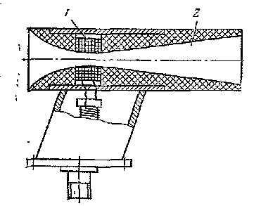 Улучшению теплообмена между никелевой проволокой и окружающей средой служат теплопроводящие прокладки 10 из серебра. Материалом для изготовления корпуса 1 служит нержавеющая сталь. В качестве указателя применяется логометр, имеющий такое же устройство, как и в ЭДМУ. При изменении температуры с помощью терморезисторных термометров возникают методические погрешности: - за счёт передачи части тепла от терморезистора к месту его крепления и конструкциям, имеющим меньшую температуру, чем температура измеряемой среды; - от торможения датчиков потока движущейся среды, при котором происходит переход в тепло кинетической энергии движущейся среды, при котором происходит переход в тепло кинетической энергии движущейся среды; - от нагрева терморезистора протекающим по нему током. Первую методическую погрешность уменьшают путём увеличения площади части датчика, погруженной в среду, и улучшения теплоизоляции непогруженной части. Вторая погрешность устраняется с помощью изменения конструкции датчиков. Для скорости набегающего потока до 100 м/с применяются конструкции, подобные рассмотренной. Торможение потока среды датчиком при таких скоростях не вызывает значительной погрешности. Для измерения температуры среды, движущейся с большими скоростями, корпус датчика конструируют так, что ЧЭ располагается вдоль набегающего потока. Корпус 2 датчика типа ТНВ для измерения температуры наружного воздуха представляет собой сопло Лаваля, которое устанавливается своей продольной осью вдоль вектора скорости набегающего потока.