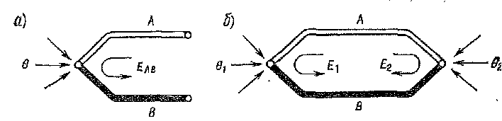 Для термопары термо-э.д.с. равна алгебраической сумме разностей потенциалов всех спаев. В термопаре, имеющей два спая, термо-э.д.с.