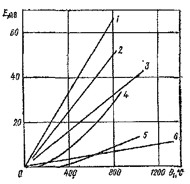 На графике представлены статические характеристики наиболее применяемых термопар при температуре холодного спая, равной 00 С, из которых видно, что термопары НК-СА и НЖ-СК имеют зоны нечувствительности, т.е. возникновение термо-э.д.с. у них начинается только при определённых температурах, для термопары НК-СА при t1>3000 С, для НЖ-СК при t1>1000 С. Благодаря этому свойству в указанных термопарах колебания температуры окружающей среды от +60 до - 600 С практически не оказывают влияние на значение термо - э.д.с. Следовательно, термометры, построенные на их основе, не имеют методической погрешности, которую вносит изменение температуры холодного спая.
