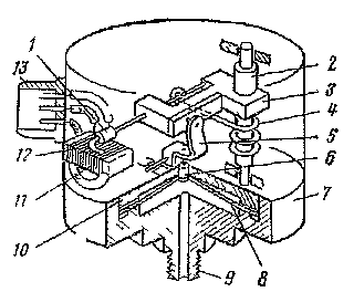 Измеряемое давление ри подаётся через штуцер 9 в полость преобразователя давления. Под действием ри происходит перемещение центра мембраны 8,толкателя 6,качалки 5, рычага 3, и щёткодержателя 13. Пружина 4 возвращает рычаг в исходное положение при уменьшении давления ри.