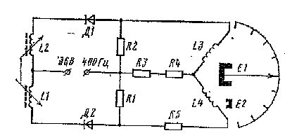 Рис.16 Электрическая схема манометра типа ДИМ В качестве УЧЭ применяются либо гофрированные мембраны, либо мембранные коробки. Жёсткий подвижный центр УЧЭ соединён с якорем индуктивного преобразователя. Катушки индуктивного преобразователя L1 и L2 совместно с резисторами R1 и R2 образуют мостовую схему, которая работает на переменном токе 36В 400 Гц. В диагональ мостовой схеме включены рамки логометрического указателя. При измерении давления деформация УЧЭ передаётся на якорь, который изменяет воздушный зазор в магнитных цепях катушек L1 и L2. Это вызывает изменения индуктивности катушек и ведёт к перераспределению токов в рамках логометра. Так как логометр работает на постоянном токе, то в качестве выпрямителей в измерительную схему введены диоды Д1 и Д2. Максимальные погрешности манометров типа ДИМ составляет ± 4%, размах шкалы указателя 1200.