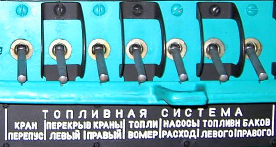 Рис.10. Щиток управления "ТОПЛИВНАЯ СИСТЕМА" 3. Два подкачивающих насосам ЭЦН-40 для подачи топлива из расходного бака к двигателям; 4. Два насоса ЭЦН-75 в подвесных баках для перекачки топлива в расходный бак; 5. Три сигнализатора давления топлива СД-29А для сигнализации включения насосов на ЩУ(при достижении в топливных магистралях избыточного давления 0,15кгс/см2); 6. Пять перекрывных топливных кранов для закрытия и открытия топливных магистралей: - два крана (пожарных) установлены в магистралях питания двигателей ТВ3-117ВМ на потолочной панели в редукторном отсеке; - для равномерной выработки топлива из подвесных баков при отказе одного из насосов; - для перепуска топлива от подвесных баков в расходный бак при отказе поплавкового клапана 766300А-1 в закрытом положении.