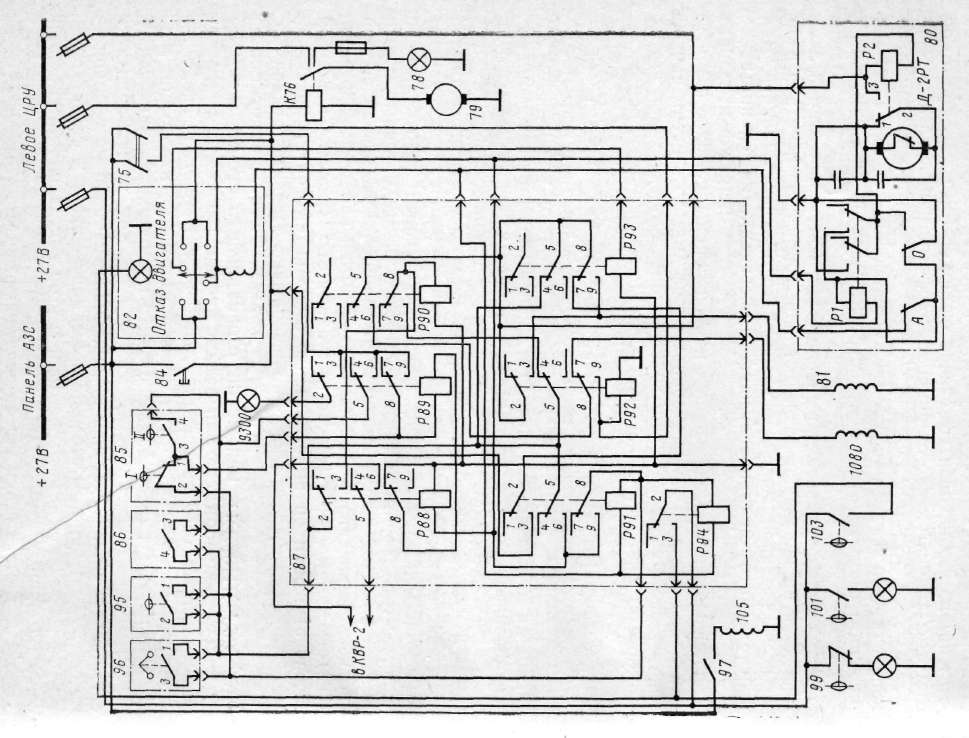 Рнс. 16. Схема флюгирования воздушного вннта левого двигателя: 68—автомат защиты сети АЗР-6; 69 — выключатель снятия винтов с упора; 70. 72 — электромагнитный клапан снятия винта с упора; 73 — предохранитель в цепи питания ПМК-18; 74 — предохранитель в цепи питания электродвигателя флюгериасоса; 75 — выключатель проверки автоматического флюгирования по крутящему моменту; 76 — контактор включения электродвигателя флюгер-насоса: 77— предохранитель в цепи сигнализации флюгирования; 78 — лампа сигнализации флюгирования винта; 79 — электродвигатель флюгерного насоса ЭМ-45; 80 — автомат времени флюгирования ПМК-18; 81 — электромагнитный клапан вывода из флюгера; 82 — лампа-кнопка ручного флюгирования КФЛ-37; 83 — автомат защиты сети в цепн питания системы флюгирования; 84 — кнопка частичного флюгирования ГР3604004СП; 85 — датчик автоматического флюгирования; 86 — датчик блокировки автоматического флюгирования; 87 — релейная коробка флюгирования; 88 — реле ручного ввода во флюгер; 89 — реле готовности флюгирования; 90— реле останова двигателя; 91 — р.еле автоматического ввода во флюгер; 92 — реле проверки флюгирования; 93 — реле вывода из флюгера; 94 — реле сигнализации отказа двигателя; 95 — датчик флюгирования по отрицательной тяге; 96 — датчик флюгирования по предельным оборотам; 97 — выключатель проверки системы автоматического флюгирования по отрицательной тяге; 98 — автомат защиты сети АЗС-2; 99 — сигнализатор снятия виита с упора СДУ-9-12.5±2,5; 100— лампа сигнализации снятия винта с упора; 101 — сигнализатор вывода из флюгера СДУ-9А-20±1; 102 — лампа сигнализации вывода из флюгера; 103 — сигнализатор по отрицательной тяге СДУ-5-2,5; /05 — электромагнитный клапан проверки флюгирования по отрицательной тяге; 2958—искрогасящий диод: 9300 — лампа сигнализации готовности системы автоматического флюгирования; 12939 — диод Д231А (ГЗ№25 вопрос 1)