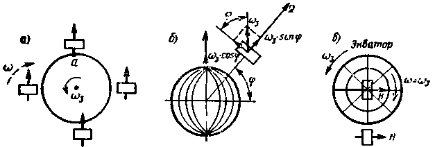 Гироскоп имеет свойство сохранять неизменным (с некоторой степенью точности) направление оси вращения ротора относительно мирового пространства (звезд). Вращение Земли и перемещение летательного аппарата вызывает кажущийся уход оси ротора гироскопа относительно первоначального положения. В этом легко убедиться из рассмотрения рис. 4.
