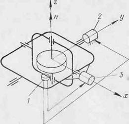 Рис. 7. Гировертикаль с маятниковой коррекцией: 1—электролитический маятник; 2, 3—коррекционные двигатели