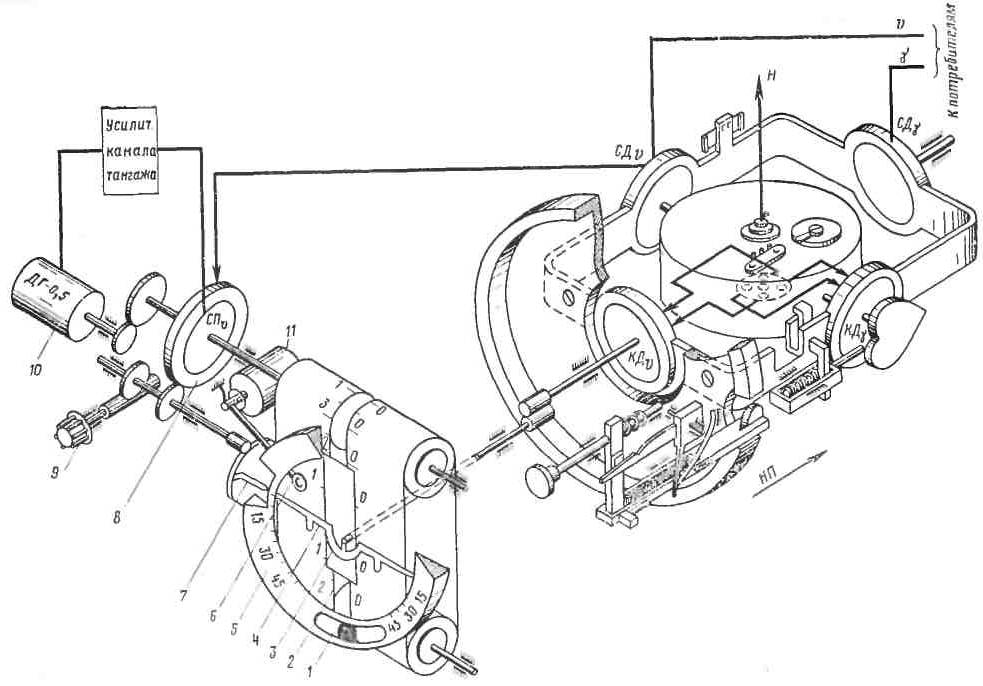 Рис. 11. Принципиальная электрокинематическая схема авиагоризонта АГБ-3; 1 — указатель скольжения; 2 — шкала тангажа; 3 — шпилька; 4 — силуэт самолетика; 5 — шкала крена; 6 — флажок сигнализатора отказа питания; 7 — индекс; 8 — дифференциальные сельсин-прнёмники: 9 — кремальера; 10 — двигатель отработки
