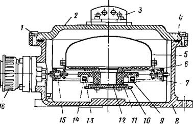 Рис. 3. Конструкция индукционного датчика ИД: 1-винт; 2-крышка;3-девиационный прибор; 4-прокладка; 5-поплавок; 6-основание; 7-наружное кольцо; 8-корпус; 9-катушка первичной обмотки; 10-чашка; 11-платформа; 12-груз; 13-сердечник; 14- катушка сигнальной (вторичной) обмотки; 15-карданов подвес; 16 -штепсельный разъем