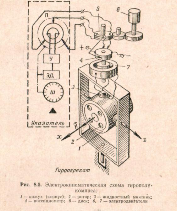 Гирополукомпас представляет собой гироскоп с тремя степенями свободы. Вследствие вращения Земли гироскоп будет «уходить» в горизонтальной плоскости со скоростью wг=wзsinφ, где wз - угловая скорость вращения Земли; φ - географическая широта места, где расположен гирополукомпас. Если с помощью специального корректирующего устройства воздействовать на гироскоп так, чтобы его угловая скорость прецессии была равна по величине угловой скорости ухода wг и противоположна ей по знаку, то ось гироскопа будет неподвижна относительно поверхности Земли. Курс, показываемый гирополукомпасом, представляет собой отклонение продольной оси летательного аппарата от первоначальной ортодромии, т. е. ортодромический курс. Ротор гироскопа приводится во вращение со скоростью до 22 000 об/минасинхронным трехфазным электродвигателем, питаемым напряжением 36 Вчастотой 400 Гц. Кожух 1 гироскопа является его внутренней рамкой. На оси внешней рамки гироскопа закреплен потенциометр 4. С его трех щеток, расположенных под углами 120° друг к другу и закрепленных на диске 5, напряжение подводится к щеткам потенциометра Пуказателя. Две диаметрально противоположные отпайки его включены на вход усилителя У, который может располагаться отдельным блоком вне корпуса указателя. При изменении курса самолета ось х гироскопа и, следовательно, потенциометр 4 своего положения в горизонтальной плоскости не изменяют; щетки потенциометра поворачиваются вместе с корпусом гироагрегата, т. е. с самолетом. Это вызывает изменение распределения потенциалов на щетках потенциометра П указателя и, следовательно, появление напряжения на входе усилителя У. Усиленное напряжение подводится к электродвигателю ЭД, который перемещает шкалу Ш указателя и щетки потенциометра П до тех пор, пока напряжение на выходе этого потенциометра не станет равным нулю. Поскольку при включении гирополукомпаса его ось х может занимать любое произвольное положение в горизонтальной плоскости, то для начальной установки шкалы указателя на необходимое значение курса в гироагрегаге имеется электродвигатель 6. При его включении щетки потенциометра 4 и, следовательно, шкала указателя будут вращаться до тех пор, пока электродвигатель не будет выключен. Управление электродвигателем осуществляется или членом экипажа, или же автоматически от магнитного компаса. Для того чтобы ось ротора гироскопа всегда располагалась в горизонтальной плоскости, на кожухе закрепляется жидкостный маятник (медный сосуд с токопроводящеё жидкостью и пузырьком.) При отклонении оси ротора от горизонтальной плоскости маятник выдает сигнал в коррекционный электродвигатель, ротор которого закреплен на оси внешней рамки гироскопа. Электродвигатель создает момент вращения относительно этой оси, обеспечивая прецессию оси х к горизонтальной плоскости. Для устранения ухода гироскопа вследствие вращения Земли необходимо создать вращающий момент относительно его оси z, который обеспечит прецессию гироскопа относительно вертикальной оси со скоростью wг=wзsinφ. В некоторых гирополукомпасах этот момент создается или специальным балансировочным грузиком, закрепляемым на корпусе гироскопа (ГИК-1 – курсовая система), или моментным электродвигателем, закрепляемым на внешней рамке гироскопа и воздействующим на ось z. На электродвиг