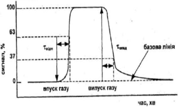 При подачі у вимipювальну камеру, в якiй знаходиться сенсор, певної концeнтpaцiї газу сигнал вiд сенсора змiнюється - зростає до максимального (чи спадає до мiнiмального) значення. Оскільки сигнал від сенсора може вiдрiзнятись вiд нуля навіть за відcyтнocтi в атмосферi газу (наприклад, сенсор резистивного типу завжди має деяке значення опору), то вводять поняття базової лінії - це сигнал сенсора до взаємодії з газом. Вимiрюеться змiна сигналу в абсолютних ( ΔT, Δq, Δm, ΔФ тощо) чи відносних одиницях за умови дії газового середовища (рис. 1.4). Час відповіді сенсора - це час, за який вихiдний сигнал сенсора досягає 63% від максимальної величини при змiнi концентрації (парціального тиску) вимiрюваного газу від нуля до даної концентрації (парціального тиску). Iнколи вживають інше визначення часу часу відповіді, коли сигнал сягає 90% вiд максимального. Визначають також і час відновлвння - це час, за який вихiдний сигнал падає до 37% (в е разiв), чи до 10% вiд максимального при змiнi концентрації (парціального тиску) вимірюваного газу до нуля. На рис. 1.5 а) представлено гpадуювальну криву у двокоординатнiй системi для найпроcтiшого випадку лiнiйного сенсора, який вимірює зміну оптичнorо чи електричного сигналу при змiнi концeнтpaцiї газу, у даному випадку - відносної. вологостi. Основними параметрами градуювальної кривої є дiапазон вимiрюваних концентрацій (х1-х2) тобто мiнiмальна х1, i максимальна граничні х2 концентреції газiв, якi можна визначати за допомогою сенсора. Цiй облаcтi (х1-х2) на шкалi сигналiв буде вiдповiдати область (у1-у2). Це так звана повна шкала вихіного сигналу.