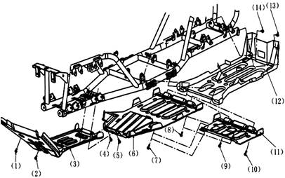 Разборка Примечание: передняя защитная пластина, центральная защитная пластина, задняя защитная пластина и двухгнездовая защитная пластина расположены снизу квадрицикла. Ремонтный персонал при работе должен находиться под квадрициклом, поэтому для обеспечения безопасности нужно обеспечить надежную фиксацию квадрицикла.