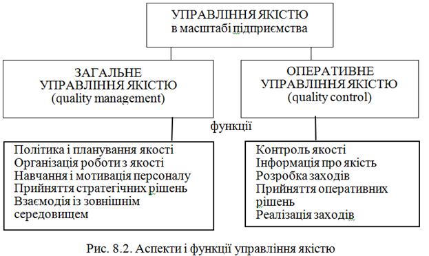Забезпечення якості — складова управління якістю, зосереджена на створенні упевненості в тому, що вимоги щодо якості буде виконано. Поліпшення якості — складова управління якістю, зосереджена на збільшенні здатності виконати вимоги щодо якості. При розгляді принципу управління якістю варто мати на увазі, що в міжнародному стандарті з термінології (ISO 9000) виділені два аспекти управління якістю: «загальне» управління якістю і управління якістю як оперативна діяльність. При цьому за логікою стандарту такі функції, як політика і планування якості, організація роботи з якості, навчання і мотивація персоналу, прийняття стратегічних рішень і взаємодія з зовнішнім середовищем повинні бути віднесені до «загального» управління якістю Контроль якості, інформація, розробка заходів, прийняття оперативних рішень і їх реалізація повинні входити до складу «оперативного» управління якістю. Для наочності розподіл функцій по зазначених аспектах управління можна представити наступним чином (рис. 8.2):