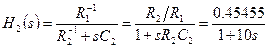 После выполнения записанной последовательности операторов в командном окне появится выражение для передаточной функции трансформатора: Transfer function: 1.562e004 s^3 + 1.388e-008 s^2 - 146.8 s + 1.134e-009 --------------------------------------------------------- s^5 + 876.3 s^4 + 1.416e005 s^3 + 1.563e005 s^2 + 379.9 s Переменная H3 будет содержать tf- выражение искомой передаточной функции H 3(s). Введём в ЭВМ передаточные функции усилительных каскадов: H1=(tf(6)+tf(10)*s)/(tf(1)+tf(10)*s); H2=tf(5)/(tf(1)+tf(10)*s); H4=-tf(1)/s/tf(40); Посчитаем передаточную функцию замкнутой системы без учёта H 1(s): W=minreal(H3*H4/(1+H2*H3*H4)); W=minreal_sh(W,0.4) Transfer function: