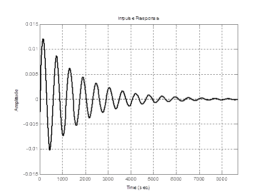 + 8062 s + 389.3 Определим корни знаменателя этой передаточной функции: [b,a]=tfdata(W,'v'); ss=roots(a) ss = -662.96 -212.18 -212.18 -1.1098 -0.099916 -0.00057583 + 0.01083i -0.00057583 - 0.01083i Расчёт импульсной характеристики показал, что передаточная функция W (s) имеет семь полюсов. Все они имеют отрицательную действительную часть, следовательно, анализируемая динамическая система устойчива. Передаточная функция H 1(s) не охвачена обратной связью и не содержит правых и мнимых полюсов, значит, она не влияет на устойчивость динамической системы. Поэтому при анализе устойчивости передаточная функция H 1(s) не учитывалась. Для подтверждения сказанного покажем последовательность операторов и сообщений в командном окне MATLAB при построении графика импульсной характеристики замкнутой системы с учётом передаточной функции H 1(s). W1=minreal(H1*W); W1=minreal_sh(W1) impulse(W1,5/min(abs(real(ss)))) grid on set(findobj('type','line'),'linewidth',2,'color',[0 0 0]) Передаточная функция замкнутой системы W1 имеет вид Transfer function: