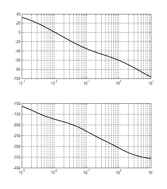+ 1.52e004 s^2. В командном окне MATLAB выполним последовательность операторов om=logspace(-3,1,1001); Hr=H2*H3*H4; [b,a]=tfdata(Hr,'v'); Hrom=polyval(b,1i*om)./polyval(a,1i*om); Lr=20*log10(abs(Hrom)); Pr=angle(-Hrom)-pi; subplot(2,1,1) semilogx(om,Lr,'k-','linewidth',2) grid on subplot(2,1,2) semilogx(om,Pr*180/pi,'k-','linewidth',2) grid on В результате в одной фигуре MATLAB будет построено два графика: ЛАЧХ и ЛФЧХ разомкнутой системы (рис. 4). По графику или с помощью интерполяции ЛФЧХ определим частоту (рад/мкс), на которой ЛФЧХ проходит через -180О: om1=interp1(Pr,om,-pi,'cubic') om1 = 0.01493 По графику или с помощью интерполяции определим частоту (рад/мкс), на которой модуль коэффициента передачи сигнала равен 0 дБ: om2=interp1(Lr,om,0,'cubic') om2 = 0.010747 Модуль коэффициента передачи сигнала (дБ) на частоте om1 определяется оператором: D1=interp1(om,Lr,om1,'cubic') D1 = -5.5566 Это означает, что система устойчива. Запас устойчивости по модулю составляет 5.5566 дБ. Дефицит устойчивости по фазе (в градусах) определяется по значению ЛФЧХ на частоте om2 оператором: D2=(-pi-interp1(om,Pr,om2,'cubic'))*180/pi D2 = -6.081 Запас устойчивости по модулю составляет 6.081 градусов.