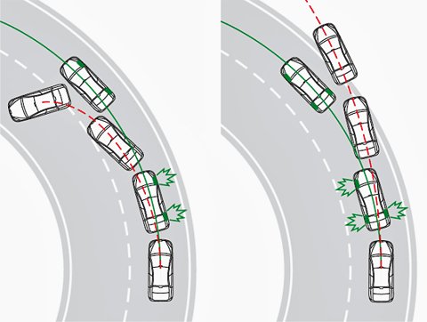 Вернуть автомобиль на нужный курс система может, давая команду на выборочное подтормаживание одного или нескольких колёс. Какое из них надо замедлить (переднее колесо или заднее, внешнее по отношению к повороту или внутреннее), система определяет сама в зависимости от ситуации. Притормаживание колёс система осуществляет через гидромодулятор АБС, создающий давление в тормозной системе. Одновременно (или до этого) на блок управления двигателем поступает команда на сокращение подачи топлива и уменьшение, соответственно, крутящего момента на колёсах. Этот рисунок наглядно иллюстрирует ситуацию, когда водитель превысил максимальную скорость вхождения в поворот, и начался занос (или снос). Красная линия — это траектория движения машины без ESP. Если её водитель начнёт тормозить, у него есть серьёзный шанс развернуться, а если нет — то улететь с дороги. ESP же выборочно подтормозит нужные колёса так, чтобы автомобиль остался на нужной траектории.