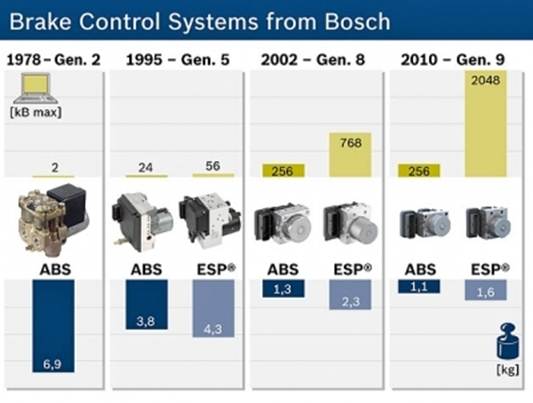 Так выглядит блок управления ESP на автомобилях Mercedes-Benz. Современная ESP взаимосвязана с ABS, антипробуксовочной системой и блоком управления двигателем, она активно использует их компоненты. По сути, это единая система, работающая комплексно и обеспечивающая целый набор вспомогательных контраварийных мероприятий. Структурно ESP состоит из электронного блока-контроллера, который постоянно обрабатывает сигналы, поступающие с многочисленных датчиков: скорости вращения колёс (используются стандартные датчики АБС); датчика положения рулевого колеса; датчика давления в тормозной системе. Но основная информация поступает с двух специальных датчиков: угловой скорости относительно вертикальной оси и поперечного ускорения (иногда это устройство называют G-сенсор). Именно они фиксируют возникновение бокового скольжения на вертикальной оси, определяют его величину и дают дальнейшие распоряжения. В каждый момент ESP знает, с какой скоростью едет автомобиль, на какой угол повёрнут руль, какие обороты у двигателя, есть ли занос и так далее.