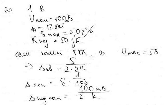 Решение Надо обратить внимание на SNR лектор предупреждал на последней лекции Он сказал, что если число квантов слишком большое то ∂кван= q/2*31/2. q= Umax/2n-1= 2,5/215= 7,62939*10-5; ∂кван= q/(2*31/2)= 7,62939*10-5/(2*31/2)= 2,20242*10-5; è ∆ кван= 2,20242*10-5*1= 2,20242*10-5 B; ∆комп= ±1мВ; SNR=90=20log(k)è k= 104,5è (1/ ∆Uшума)= 104,5è ∆ Uшума=3,16228*10-5B; ∆ = ∆ кван + ∆комп + ∆ Uшума= 2,20242*10-5 + 10-3 + 3,16228*10-5 = 1,053647*10-3B; Ответ: ∂=∆*100/1 = 0,11%