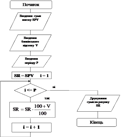 Як приклад розглядається створення програми обчислення суми на рахунку в банку. Користувач повинен ввести такі дані: суму попереднього внеску на рахунок - SPV, банківський відсоток - V, період часу - P. Після натиснення кнопки Розрахунок, програма повинна вивести суму SR, яка буде на рахунку після P років при визначеному банківському відсотку, якщо відома сума первинного внеску. Формула розрахунку суми така: 1. На початок роботи програми SR = SPV. 2. Кожного року сума на рахунку змінюється таким чином