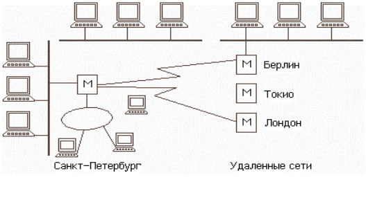 · Маршрутизатор (англ. Router) поєднує мережі з загальним протоколом більш ефективно, чим міст. Він дозволяє, наприклад, розщеплювати великі повідомлення на більш дрібні шматки, забезпечуючи тим самим взаємодія локальних мереж з різним розміром пакета. Маршрутизатор може пересилати пакети на конкретну адресу (мости тільки відфільтровують непотрібні пакети), вибирати кращий шлях для проходження пакета і багато чого іншого. Чим складніше і більше мережа, тим більше вигода від використання маршрутизаторів. · Мостовий маршрутизатор (англ. Brouter) — це гібрид моста і маршрутизатора, що спочатку намагається виконати маршрутизацію, де це тільки можливо, а потім, у випадку невдачі, переходить у режим моста. · Шлюз (англ. GateWay), на відміну від моста, застосовується у випадках, мережі, що коли з'єднуються, мають різнімережні протоколи. Повідомлення, що надійшло в шлюз, від однієї мережі перетвориться в інше повідомлення, що відповідає вимогам наступної мережі. Таким чином, шлюзи не просто з'єднують мережі, а дозволяють їм працювати як єдина мережа. C допомогою шлюзів також локальні мережі приєднуються до мєйнфреймам — універсальних могутніх комп'ютерів.