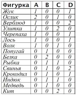 Первый этап проектаУчащиеся самостоятельно работают с задачей 1, а также участвуют в общем обсуждении своих действий. Сначала ребятам предлагается придумать, как (быстрее) отыскать одинаковые мешки в задаче 1. Для этого учащиеся обычно начинают беспорядочно сравнивать пары (ведь именно так они находили одинаковые мешки в задачах учебника). Надо сразу договориться: тот, кто считает, что получил ответ, показывает его только учителю, чтобы не лишать товарищей радости самостоятельного поиска. Кто-то, выбирая пары случайно, найдёт два одинаковых мешка. В этом случае надо попросить удачливого ученика проверить, нет ли здесь ещё одинаковых мешков. В процессе обсуждения способов сравнения мешков обязательно должен прозвучать вариант составления таблиц мешков. Действительно, сравнить две колонки чисел гораздо легче, чем два беспорядочно уложенных мешка. Каждый мешок нужно представить в виде колонки чисел — какие фигурки и в каком количестве в нём лежат. Но состав фигурок в каждом мешке свой. Можно для начала взять два мешка, скажем мешки А и С (пара А и В не годится, потому что эти мешки вообще не пересекаются), и попытаться сравнить их с помощью составления таблиц. Предложите детям подумать, как составить таблицы для мешков так, чтобы их впоследствии было удобно сравнивать. Если составлять таблицы для А и С по отдельности (дети уже делали это в задачах), то сравнивать их потом будет не намного проще, чем сами мешки. Так постепенно рождается мысль о том, что таблицы мешков должны быть «унифицированы», т. е. список и порядок фигурок для заполнения таблицы каждого мешка должны быть одинаковыми. В таком случае таблицы мешков могут быть колонками одной таблицы, и эти колонки будет легко сравнивать. Самый левый столбец в таблице (шапка) — список всех фигурок, встречающихся в мешках, а в следующих столбцах мы сможем записать, сколько каких фигурок в мешках, т. е. заполнить таблицы для мешков А и С. Если какой-то фигурки в одном из мешков нет, то в соответствующей клетке просто ставим ноль. В ходе разговора на доске появится таблица, похожая на таблицу к задаче 1, но только меньше. Левый столбец таблицы тоже заполняется в ходе просмотра мешков А и С: берём мешок А, выписываем названия всех фигурок, которые там встречаются, затем берём мешок С и дописываем ниже названия тех фигурок, которых в первом столбце таблицы ещё нет (их не было в мешке А). При этом напротив этих новых названий в столбце для мешка А можно сразу проставить нули. Главная ошибка при выполнении этой работы — занести в список дважды одну и ту же фигурку (и назвать одну и ту же фигурку разными именами). После того как общий список готов, можно заполнить колонки (таблицы мешков) для А и С. По окончании работы учащиеся не только убеждаются в том, что мешки А и С разные, но и получают алгоритм (способ) для дальнейшей работы. Точно так же можно поступить и с остальными мешками. Составив один общий список всех фигурок, которые встречаются в мешках хотя бы один раз, можно заполнить таблицу для каждого мешка и потом сравнить колонки чисел. По окончании общего обсуждения каждому учащемуся предлагается самостоятельно поработать со сводной таблицей (с. XXХIХ вкладыша). В первом столбце должен содержаться общий список всех фигурок, встречающихся в мешках. Ребёнок может составить его сразу целиком или по 