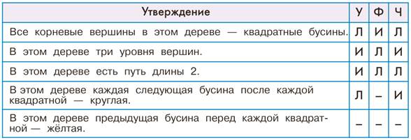 Задача 3. Задача на проверку усвоения алгоритма поиска всех путей дерева. Ответ: Вариант 1 Вариант 2 ДАЧА КАФЕ ДАЧИ КАША ДО КАШУ ДОМ КА ДОХА КОТ ДОЧЬ КОФЕ Задача 4. Задача на использование таблицы при склеивании двух мешков цепочек. Здесь приходится использовать знания русского языка (хотя и в минимальной степени): необходимо понимать, что такое основа и окончание слова. Ответ: Вариант 1 Основы слов: МОКР, КРУГЛ, БЕЛ, СВЕТЛ, окончания: ЫЙ, АЯ, ОЕ, ЫЕ. Вариант 2 Основы слов: РАНН, ЗИМН, СИН, ВЕРХН, окончания: ИЙ, ЯЯ, ЕЕ, ИЕ. Задача 5. Задача на усвоение лексики, относящейся к дереву, в том числе на использование понятий «перед каждой», «после каждой» для вершин дерева. В этой задаче детям встретятся сложные случаи, когда утверждение для данного дерева не имеет смысла. Решение задачи: Вариант 1