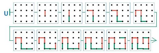Такие рассуждения дают нам не только решение задачи, но и подход к более широкому кругу вопросов, возникающих вокруг данной задачи. Например, возможна ли вообще такая партия игры «ползунок» на поле 4 × 4, в которой выигрывает Второй? Да, если мы сможем построить ломаную из чётного числа звеньев. Сколько ходов вообще может быть в игре на поле 4 × 4? Например, может ли быть 20 ходов? Нет, так как точек на поле всего 16, а значит, ломаная может состоять не более чем из 15 ходов-звеньев. Вы можете обсуждать вышеперечисленные вопросы, а можете совсем их не касаться. Однако приведённые рассуждения могут вам помочь в тот момент, когда у ребёнка работа над задачей застопорится. Если вам хотелось бы не подсказывать ему решение, а лишь навести на мысль, то достаточно замечаний типа: «Ты захватил в ползунок слишком много точек поля, поэтому ходов получилось больше, чем требуется. Попробуй оставить в стороне какие-то точки». Или что-то в этом роде в зависимости от ситуации. Решений в данной задаче достаточно много. Поучительно сравнить решения, полученные разными ребятами, и выделить в них общее. Ответ: одна из возможных цепочек: