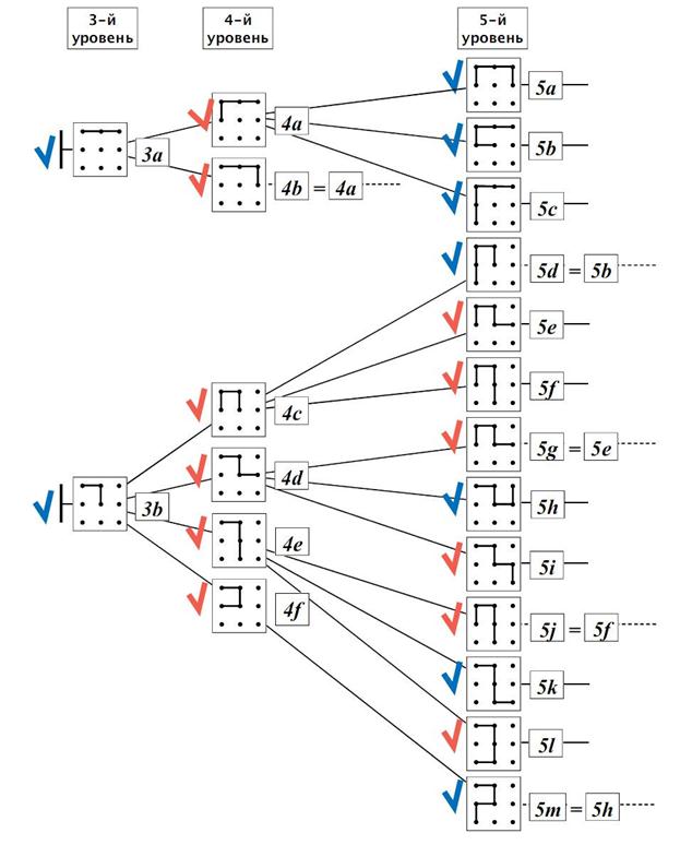 Ребята переходят к разметке выигрышных и проигрышных позиций начального фрагмента дерева (первых пяти уровней). Поскольку, помечая позиции как выигрышные или проигрышные, мы двигаемся от последнего уровня к корневой позиции, следует начать со с. 5. Сначала ребята находят ещё не обведённые позиции пятого уровня (5d, 5g, 5j, 5m) и обводят их тем же цветом, которым помечены такие же позиции (соответственно 5b, 5e, 5f, 5h). Теперь можно перейти к позициям четвёртого уровня и пометить там все позиции, из которых прорисованы следующие (4a, 4c, 4d, 4e, 4f). При этом ребята используют приведённые выше правила определения выигрышных и проигрышных позиций. Интересно, что все помеченные позиции четвёртого уровня оказались выигрышными, значит, и все оставшиеся позиции четвёртого уровня также следует обвести красным. Итак, все позиции четвёртого уровня оказались выигрышными. По нашему правилу все позиции предыдущего уровня будут проигрышными. Теперь переходим на с. 4. Помечаем все позиции третьего уровня как проигрышные, значит, все позиции второго уровня — выигрышные, а начальная позиция — проигрышная. Как видите, ситуация здесь на всех уровнях, кроме четвёртого, является совсем простой, поэтому мы и предлагаем это задание для самостоятельной работы. Ниже приводится разметка первых пяти уровней дерева.