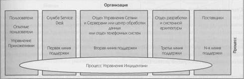 Управление Инцидентами Задача Процесса Управления Инцидентами является реактивной — уменьшение или исключение отрицательного воздействия (потенциальных) нарушений в предоставлении ИТ-услуг, таким образом обеспечивая наиболее быстрое восстановление работы пользователей. Для выполнения этой задачи производится регистрация, классификация и назначение инцидентов соответствующим группам специалистов, мониторинг хода работ по разрешению инцидентов, решение инцидентов и их закрытие. Так как это требует тесного взаимодействия с пользователями, фокусной точкой Процесса Управления Инцидентами обычно является функция Service Desk1, которая играет роль центра контактов пользователей с «внутренними» коллективами технических служб. Управление Инцидентами является важнейшей основой для работы других процессов ITIL, предоставляя ценную информацию об ошибках в работе ИТ-инфраструктуры. На рис. 4.1 показан схематичный пример Управления Инцидентами как горизонтальный процесс, охватывающий разные ИТ-отделы и осуществляющий эффективное управление и контроль обработки потока инцидентов.