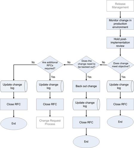 Если в результате голосования членов CAB оценка остается не утвержденной, это может иметь одно из двух описанных ниже последствий. · Члены CAB могут решить, что оценка не соответствует всем критериям, необходимым для ее утверждения, но сам проект может им соответствовать после проведения дополнительных работ в определенных областях. В этом случае CAB отмечает проект, рассматриваемый в оценке, как неудовлетворительный, но сам RFC и утвержденное изменение остаются в силе. Документ RFC возвращается в ту фазу развертывания, которая была только что завершена. Менеджер изменений обновляет журнал изменений, подробно описывая дополнительные работы, которые должны быть выполнены, для того чтобы изменение можно было перевести в следующую фазу. · Еще один вариант состоит в том, что CAB (или, возможно, ITEC, если решение было передано на более высокий уровень организационной структуры) может решить не утверждать промежуточный этап и вообще отказаться от изменения. Такая ситуация может, например, возникнуть в фазе планирования, если будет решено, что проект невозможно выполнить вовремя, с соблюдением всех необходимых требований и в рамках имеющегося бюджета. Вместо того, чтобы заниматься переработкой плана, CAB может принять решение полностью отказаться от реализации проекта и заняться поиском решения на основе полностью другого способа, например, такого, как аутсорсинг. В этом случае RFC закрывается. В том и другом случае происходит модификация изменения с указанием причин принятого решения и информируется инициатор изменения, а также все прочие заинтересованные стороны. Если CAB утверждает оценку промежуточного этапа, то процесс развертывания переходит в следующую фазу — становится процессом релиза. Дополнительные сведения о том, какие конкретные действия связаны с осуществлением этого проекта, приведены в документе MOF Release Management Service Management Function. Резюме Подводя итог, можно отметить, что процесс разработки и реализации изменения предусматривает выполнение следующих действий. · Изменение планируется для выполнения в соответствии с приоритетами бизнеса и процедурой внесения изменений, а также с учетом категории и приоритета самого изменения. · Назначается владелец изменения, который способен реализовать изменение согласно требованиям по технологии, объему, приоритету и категории. · Осуществляется контроль над тем, соответствует ли процесс разработки изменения принятому жизненному циклу разработки. · Проводится контроль промежуточных этапов с участием членов CAB для обеспечения того, чтобы каждая фаза была завершена успешно. · Обеспечивается гарантия того, что изменение, разработанное и прошедшее через процесс развертывания, соответствовало установленным критериям. Оценка изменения Вслед за успешной реализацией и развертыванием в производственной среде или, как в случае стандартного изменения, вслед за развертыванием в производственной среде, должен быть проведен процесс оценки для определения того, имеет ли изменение желаемый результат и соответствует ли требованиям первоначального запроса на изменение. Процесс оценки изменения определяется блок-схемой, которая показана на рис. 9.