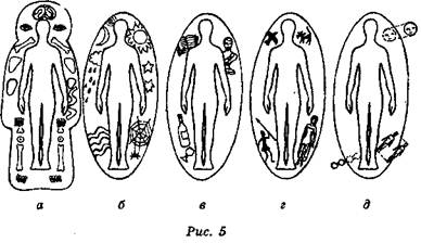 Можно ли считать совсем бедным и одиноким человека, у которого ничего нет, кроме него самого. Эту информацию я даю для тех, кто впервые взял в руки книгу подобного рода. Тем, кто давно увлекается парапсихологией, можно пропустить эту главу..„Вряд ли я смогу сообщить что-либо новое, разве что узнаете мое личное толкование. Если вы не сиамский близнец, то у вас всего одного тело — физическое. Некоторые образованные люди говорят: «Omnia шеа mecum porto», что в переводе с латыни звучит так: «Все свое ношу с собой*. И этот человек не совсем беден и одинок. Его всегда одновременно семь, как минимум. Помимо тела физического, есть еще шесть основных тел, взаимопроникающих и действующих каждое само по себе. И это не дракон о семи го л рвах, хотя можно при желании объяснить и через этот образ (рис. 4). Мы знаем свое физическое тело и всячески стараемся его развивать, подкармливать и лелеять. И почти совсем не заботимся о других телах. Да что там забота? Мы их не видим, не чувствуем, не придаем им значения. Многие просто о них не подозревают. Тем не менее все читатели наверняка слышали определение чистого и светлого человека — «эфирное создание». Так говорят о непорочном и нежном человеке, чаще о ребенке или молодой девушке. Похоже высказывание «божий одуванчик» — о старых людях, которые добры, светлы лицом и душой. Что такое эфирное тело? Это первое тонкое тело человека. Оно большее по объему и находится непосредственно около физического и повторяет его форму. Оно первое реагирует на воздействие окружающей обстановки и передает импульс телу физическому. В зависимости от его величины человек чувствует себя хорошо или плохо, если у него ничего не болит. Там, где это тело ослаблено и маленькое по величине, чувствуется слабость или тяжесть в теле, иногда боль. На эфирном теле находятся проекции тела физического. Эфирное тело выступает над физическим сантиметров на пять. По нему экстрасенсы проводят диагностику физического состояния человека, чувствуют места патологий и могут 41 увидеть» серьезную болезнь в самом ее начале* когда это еще не проявляется явно в физическом теле, а поэтому не может диагностироваться обычными способами. Эфирное тело хорошо развито у здорового и тренированного человека, именно оно поставляет энергию остальным тонким телам (рис. 5, а).