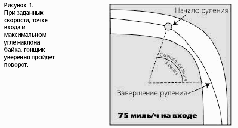 Но вот что странно – в неприятных ситуациях "уличные" водители проходят поворот с большим углом наклона, чем это необходимо при данной скорости. Да и многие гонщики делают то же самое. Они как бы выбирают кредит наклона. Есть возможность наклониться или нет (подножки или глушитель уже высекают искры), они все равно стараются завалить байк еще больше. Я часто видел, как гонщики царапают части мотоцикла в поворотах, которые можно пройти на 5‑10 миль в час быстрее и при этом с меньшим углом наклона. Чем круче угол – тем лучше? Или вы предпочтете проходить поворот быстрее с меньшим углом?