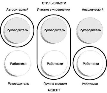 Рис. 6.3. Различные стили руководства по концентрации власти в руках руководителей, руководителей и работников или только работников Ситуационный подход (начало 1960-х гг.) утверждает, что решающую роль для эффективности лидерства играют ситуационные факторы, при этом не отвергает важность личностных и поведенческих характеристик. Ситуационные подходы отличаются большей аналитичностью, побуждают менеджеров к изучению сложившейся в организации ситуации и выбору адекватного ей стиля руководства. В основе исследований, проводимых Р. Блейком и Дж. Моутон лежали идеи Ренсиса Лайкерта (Rensis Likert) и других ученых, работавших в университетах штатов Огайо и Мичигана в 1940-х годах над проблемой определения поведенческих характеристик успешных лидеров. Роберт Блейк (Robert R. Blake, 1918—2004 гг.) и Джейн Моутон (Jane Srygley Mouton Houston, 1930—1987) работали на факультете психологии техасского университета (США) с 1950-х годов. Они известны как авторы концепции «управленческой решетки» (Managerial Grid), применяемой для изучения управленческого поведения и лидерства. Впоследствии они создали компанию Scientific Methods Inc. (позже переименована в Grid International Inc.) для распространения своих методов организационного развития и повышения эффективности управления. Р. Блейк и Дж. Моутон определили две основные движущие силы управленческого поведения: забота о выполнении работы и забота о людях, делающих эту работу. Они утверждали, что руководитель, уделяющий излишне много внимания рабочим задачам (concern for production), создает предпосылки для усиления недовольства работников, что приводит к конфликтам. С другой стороны, чрезмерная озабоченность руководителя тем, чтобы избежать конфликтов и поддерживать хорошие отношения с подчиненными (concern for people) наносят ущерб достижению производственных целей и задач. Для наглядного представления различных соотношения таких качеств руководителя, как «степень учета интересов людей» и «степень учета интересов производства» была создана координатная сетка — так называемая «управленческая решетка» (рис. 6.4).