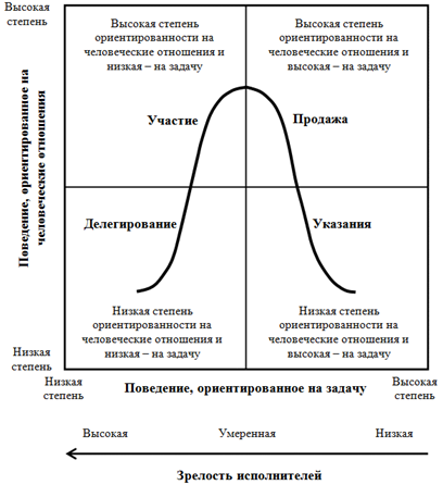Рис. 6.5. Результаты проведенного в соответствии с моделью Ф. Фидлера Лидеры, ориентированные на задачу, наиболее эффективны в ситуациях 1, 2, 3 и 8. Лидеры, ориентированные на человеческие отношения, лучше всего работают в ситуациях 4, 5 и 6. В ситуации 7 эффективны как те, так и другие. Например, пусть между руководителем отдела и его сотрудниками давно сложились хорошие отношения, сотрудники уважают и ценят своего руководителя. Задача, которую решает отдел в настоящее время, вполне структурирована, т.е. руководитель знает, в какой последовательности ее нужно решать, какие задания дать каждому сотруднику, когда следует ожидать результата и т.п. При этом руководитель имеет сильные полномочия, т.к. является экспертом в своем деле и имеет право поощрять своих сотрудников премиями за успешную работу. Очевидно, что согласно модели Фидлера, такая ситуация соответствует номеру 1. А это значит, что руководитель может себе позволить быть достаточно требовательным по отношению к своим сотрудникам и в качестве главного приоритета рассматривать своевременное и качественное решение поставленной задачи. Сотрудники не будут проявлять недовольства таким поведением своего руководителя. Однако в ситуации под номером 4 руководитель будет вынужден проявлять себя как лидер, мотивированный человеческими отношениями, т.к. ему будет очень трудно (или невозможно) обойтись без помощи своих сотрудников в решении поставленной задачи. Теория жизненного цикла была предложена американскими учеными П. Херси (Paul Hersey) и К. Бланшаром (Ken Blanchard). По мнению авторов этой теории, самые эффективные стили лидерства зависят от «зрелости» исполнителей. Под «зрелостью» исполнителей понимается не их возраст, а образование и опыт в отношении конкретной задачи, которую необходимо выполнить, способность нести ответственность за свое поведение, желание достигнуть поставленной цели. Понятие «зрелость» лица или группы нельзя рассматривать в отрыве от характеристики конкретной ситуации. Руководитель должен менять свое лидерское поведение в зависимости от относительной зрелости группы в каждой конкретной ситуации. Согласно теории жизненного цикла, существуют четыре стиля лидерства, соответствующие различным уровням «зрелости» исполнителей (рис. 6.6).