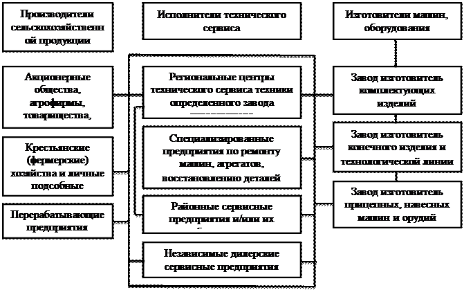 Производитель сельскохозяйственной продукции – это юридическое или физическое лицо, производящее сельскохозяйственную продукцию. Юридическое или физическое лицо, занятое производством сельскохозяйственной продукции, называют сельскохозяйственным предприятием (товаропроизводителем), если доход от этого вида деятельности больше половины общего дохода, включающего другие виды деятельности. К ним относятся акционерные общества, сельскохозяйственные кооперативы, товарищества, государственные и муниципальные сельскохозяйственные унитарные предприятия, К(Ф)Х и Л(П)Х. Исполнитель услуг (работ) – юридическое или физическое лицо, выполняющее услуги (работы) по ТС. Представителями сервисных предприятий являются районное ремонтно-техническое предприятие, ремонтный завод, автотранспортное предприятие. Исполнителем услуг может быть изготовитель технических средств или независимое от него предприятие, универсальное или специализированное на определенных видах продукции или деятельности. По виду предоставляемых услуг и выполняемых работ, различают предприятия и организации снабженческие (торгующие машинами, запасными частями, материалами: нефтепродуктами, электроэнергией, удобрениями и т.д.), ремонтные, ремонтно-технические, монтажно-наладочные, прокатно-подрядные (МТС, автотранспортные, уборочно-транспортные отряды и т.д.) Изготовитель технических средств – юридическое лицо (предприятие, объединение предприятий, фирма и т.п.) или физическое лицо, изготавливающее технические средства (машины, оборудование, материалы, сооружения). Кроме традиционных исполнителей ТС в сельском хозяйстве на рынке услуг функционируют и новые: центры технического сервиса, дилеры и машинно-технологические станции. Центр технического сервиса – это предприятие по оказанию услуг, выполнению работ по обеспечению потребителя техническими средствами производства, эффективному использованию и поддержанию их в исправном состоянии на протяжении всего периода эксплуатации. Различают центры технического сервиса по зоне деятельности: региональные и районные; по виду продукции: тракторные, автомобильные, комбайновые, строительных машин, гидроагрегатов и т.п.; по отношению к заводу-изготовителю: фирменные и независимые; по структуре услуг специализированные и универсальные. Основные функции регионального технического центра сервиса: получение от изготовителя машин, их разгрузка, оплата, досборка, обкатка, подготовка к эксплуатации (регулирование), доставка потребителю, обучение его правилам эксплуатации, продажа, выполнение обязанностей изготовителя по гарантиям, ремонт и обслуживание по заявкам потребителя, обеспечение запасными частями и оборудованием для обслуживания и ремонта, шлейфом прицепных и навесных машин, сбор информации о качестве проданных машин при эксплуатации для изготовителя, изучение потребности в реализуемой продукции, ее реклама. Центр технического сервиса создают при районном ремонтно-техническом предприятии, ремонтном заводе, автотранспортном предприятии. Структура регионального центра сервиса: торговое подразделение, склад машин, запасных частей; цех досборки, предпродажного обслуживания, доставки; базовое предприятие по ремонту машин; цех технического обслуживания и ремонта в гарантийный и послегаран