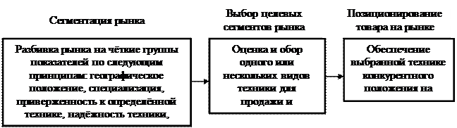 Основными мероприятиями при этом являются: 1. Разбивка рынка на группы в соответствии со спросом на технику и услуги ТС. 2. Оценка и отбор товаропроизводителей, на которых будет направлена деятельность дилерского пункта. 3. Позиционирование товара на рынке и разработка детального комплекса маркетинга.