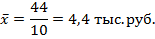 Вывод: Средняя цена на товар по 10 магазинам составляет 4,4 тыс. руб. Средний разброс цены вокруг среднего уровня составляет 0,283 тыс. руб., максимальное различие в ценах 0,9 тыс. руб. Так как средняя степень разброса цены 6,4% <33%, то совокупность можно считать однородной по данному признаку. Распределение магазинов по цене на данный товар имеет незначительную правостороннюю асимметрию.